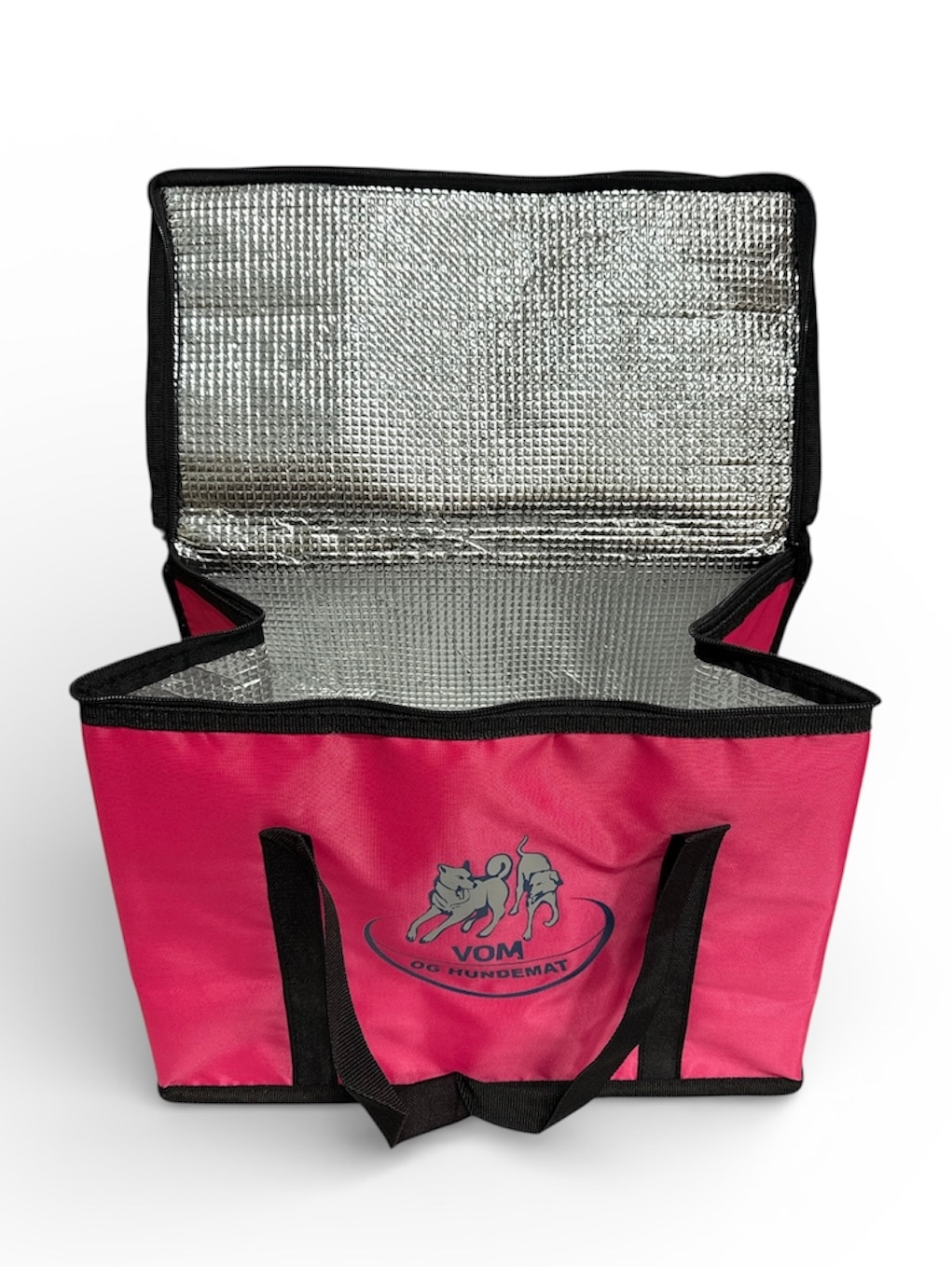 Den här kylväskan är specialdesignad för att rymma 20 stycken 500‑grams korvar från Vom og Hundemat. Med effektiv kylhållning, slitstarkt material och smidig dragkedja håller den fodret fräscht under transport. Perfekt för resor, träningar, tävlingar eller när du behöver ta med hundens mat på ett tryggt och hygieniskt sätt.