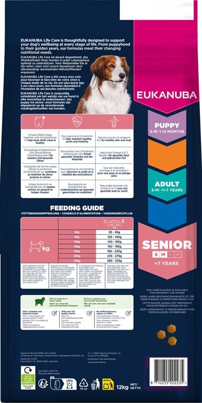 Maten är 100% komplett och balanserad. Med mycket lamm och ris är Eukanuba perfekt för äldre hundar av stora raser såsom taxar, collies, mopsar och cocker spaniel.
