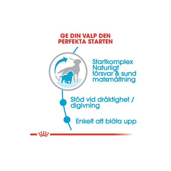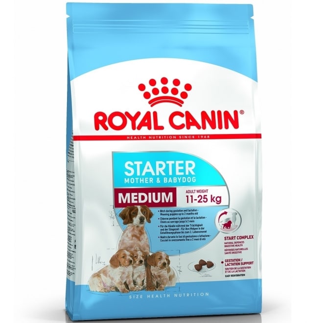 Royal Canin Medium Starter är ett foder som är speciellt anpassat för att tillgodose medelstora (dräktiga) tikars energibehov, samtidigt som det främjar en hälsosam utveckling av hennes diande valpar. Fodret ges även till valparna under avvänjningen upp till 8 veckors ålder (kan lätt blötläggas och får en smaklig grötliknande konsistens).