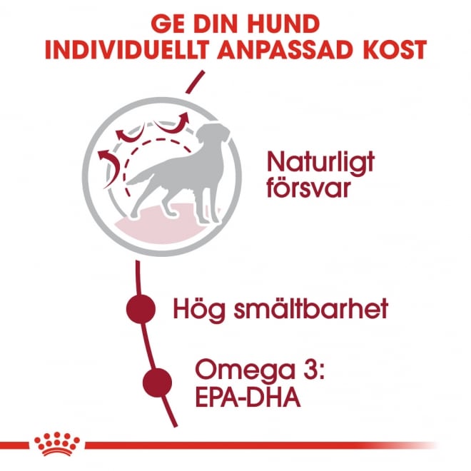 Fodret innehåller ett antioxidantkomplex och utvalda näringsämnen för att stödja din hunds naturliga försvar, samt högkvalitativt protein och ett balanserat tillskott av kostfibrer för att bidra till en sund tarm- och maghälsa. Fodret är även berikat med omega-3-fettsyror som EPA och DHA för att bidra till att bibehålla din hunds hud och päls i ett hälsosamt och gott skick.