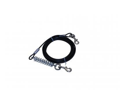 Uppkopplingsvajer för dig som vill binda upp hunden säkert. Hunden kan ej tugga av vajern, den har en fjäder som skyddar mot tvärstopp om hunden rusar. Längd: 4,7m. Kan fästas i valfri ögla eftersom den har en hake i båda ändar. Kan med fördel fästas i en tjuderskruv så får hunden ordenligt med utrymme att röra sig på. Obs, du får enl. lag inte koppla upp hunden i koppel utan uppsikt.