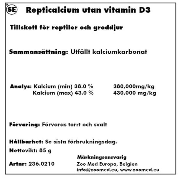 Ingredienser Utfällt kalciumkarbonat Garanterad analys % eller IE Mängd per kg Vattenhalt (max) 1,0 % Kalcium (min) 38,0 % 280000 mg Kalcium (max) 43,0 % 430000 mg Vitamin D3 (min) 0,0 % 0,0 IE