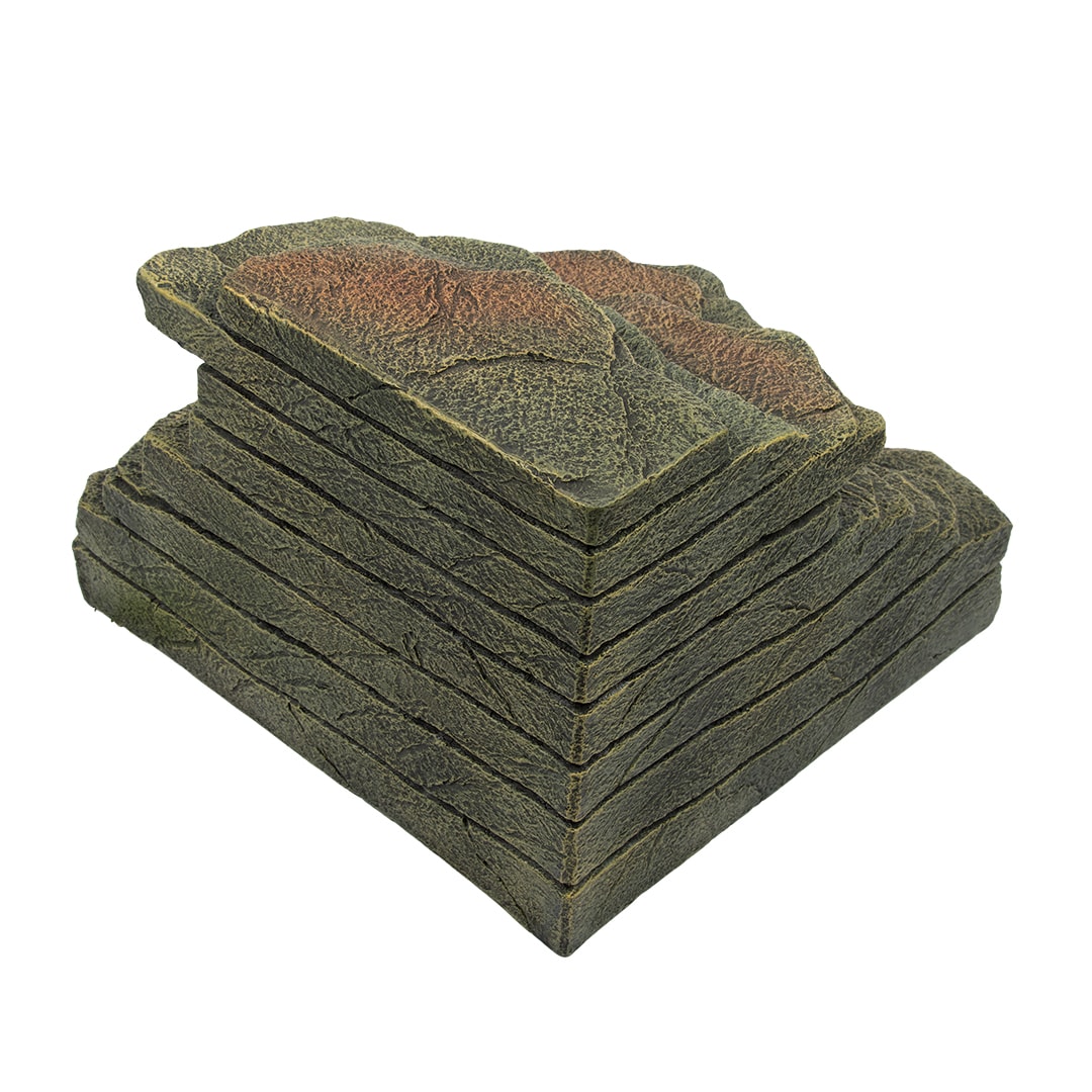 Denna hörnformade grotta med klippstruktur ger reptiler en naturlig och stimulerande miljö i terrariet. Designen inkluderar en trappa och fungerar både som gömställe och som utkiksplats för nyfikna reptiler. Den realistiska stenstrukturen bidrar till en autentisk terrariemiljö och gör grottan till ett dekorativt inslag.
