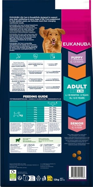 Eukanuba torrfoder med lamm och ris är ett helfoder för vuxna hundar av stora raser. Det är skonsamt för känsliga magar, främjar starka muskler, friska leder och en glänsande päls – samtidigt som det stödjer tandhälsa och viktkontroll.