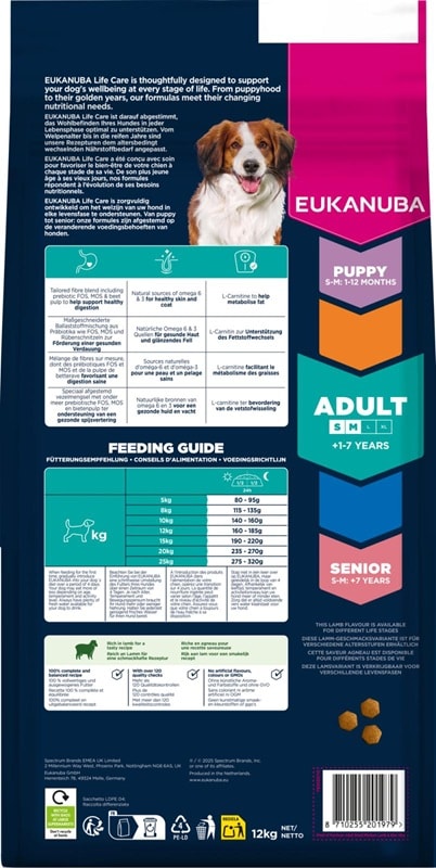 Eukanuba Life Care Lamm & Ris är ett helfoder särskilt utvecklat för aktiva hundar mellan 1–7 år av små och medelstora raser. Fodret kombinerar lamm och ris som huvudingredienser, vilket gör det extra skonsamt för känsliga magar och bidrar till en optimal matsmältning. Den skräddarsydda fiberblandningen med prebiotika och betmassa stödjer ytterligare näringsupptag och en balanserad tarmflora.