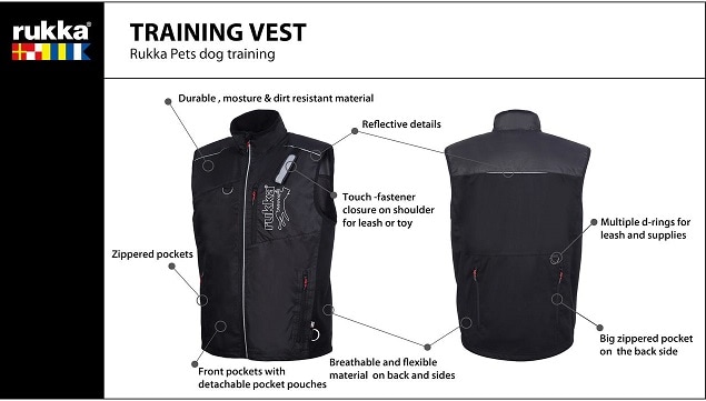 Rukkas träningsväst kombinerar smuts- och vattenavvisande material med ett softshelltyg som andas. Softshell-tyget gör träningsvästen flexibel och bekväm även i sommarväder. Rukkas träningsväst fungerar perfekt för hobbyer såväl som för professionellt bruk. Västen har flera fickor att lägga godsaker, träningsmaterial och dina egna personliga tillhörigheter i. Det finns en touch-knäppning på axeln för att fästa kopplet när det inte används.